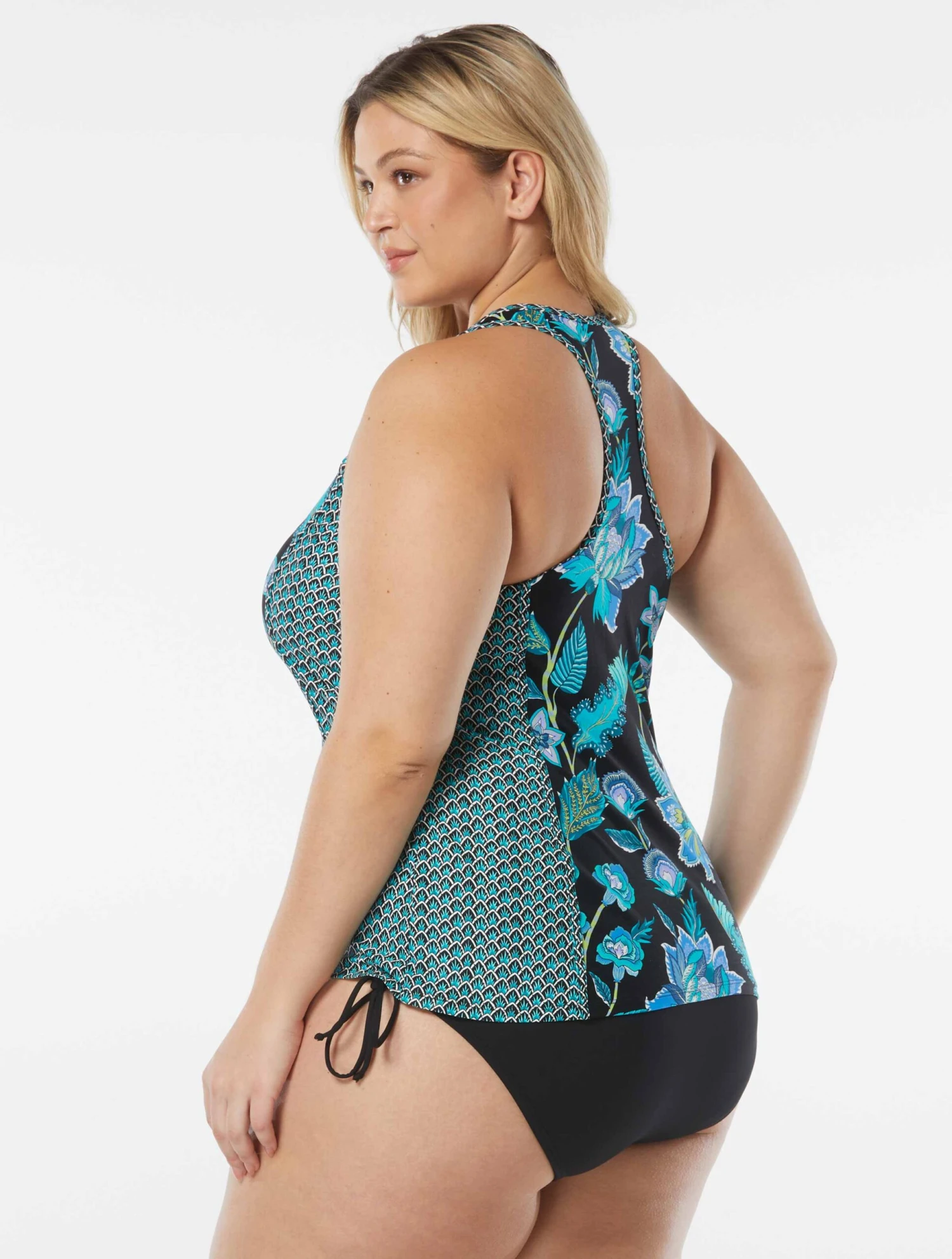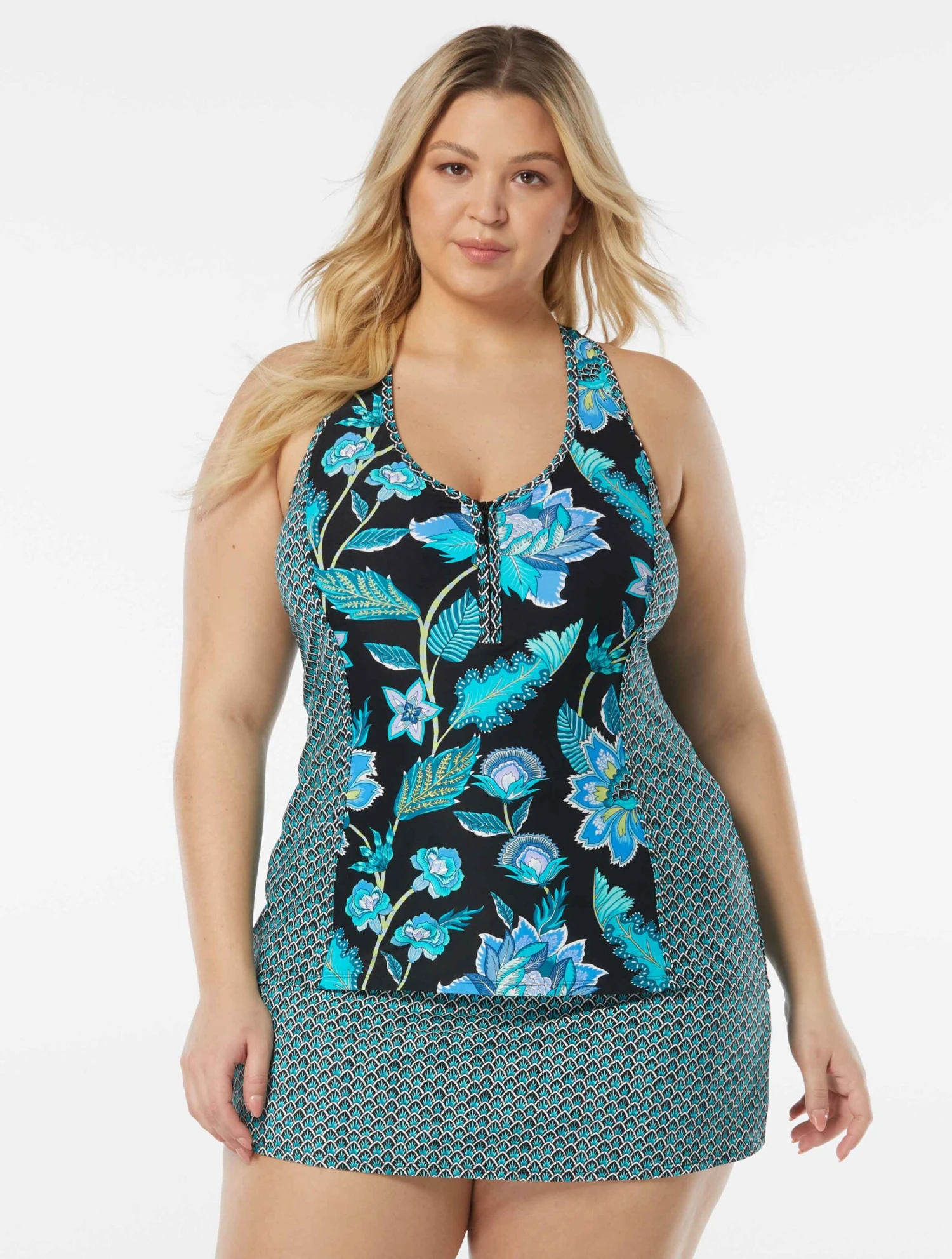 Get the sweet and sporty look all-in-one swimsuit this season! The Beach House Swim Plus Size Erinna Racerback Tankini Top in a vineyard inspired floral print pairs with a comfortable v-neck embellished with a front zipper for a stylish swimsuit. This true racerback tankini provides quality coverage and additional support with sewn in cups. Beach House swimwear is designed with high-end fabrics that bend with you for extra comfort, easy fit and shape retention.