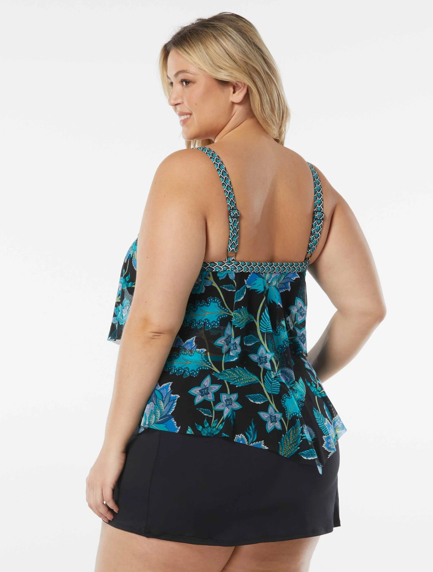 Stay trendy this season in the Beach House Plus Size Portia Mesh Layer Tankini Top. This tankini top features layers of sheer mesh lightweight fabric for breathability in a vineyard inspired floral print, adding feminine fashion to your swimsuit collection. Beach House swimwear is designed with high-end fabrics that bend with you for extra comfort, easy fit and shape retention.