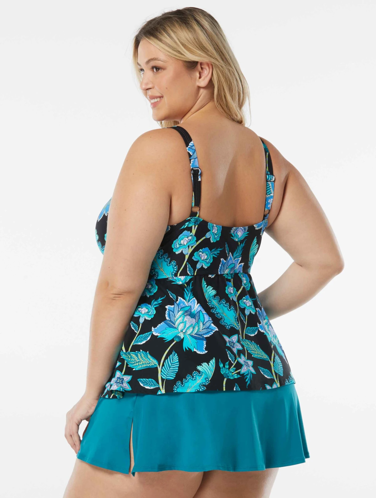 The Beach House Swim Plus Size Willow Underwire Twist Tankini Top flatters your body with a flowy silhouette in a vineyard inspired floral print and twisted details. This flattering swimsuit provides underwire and removable soft cups for shaping, adjustable straps for a customized fit and feminine style. Beach House swimwear is designed with high-end fabrics that bend with you for extra comfort, easy fit and shape retention.