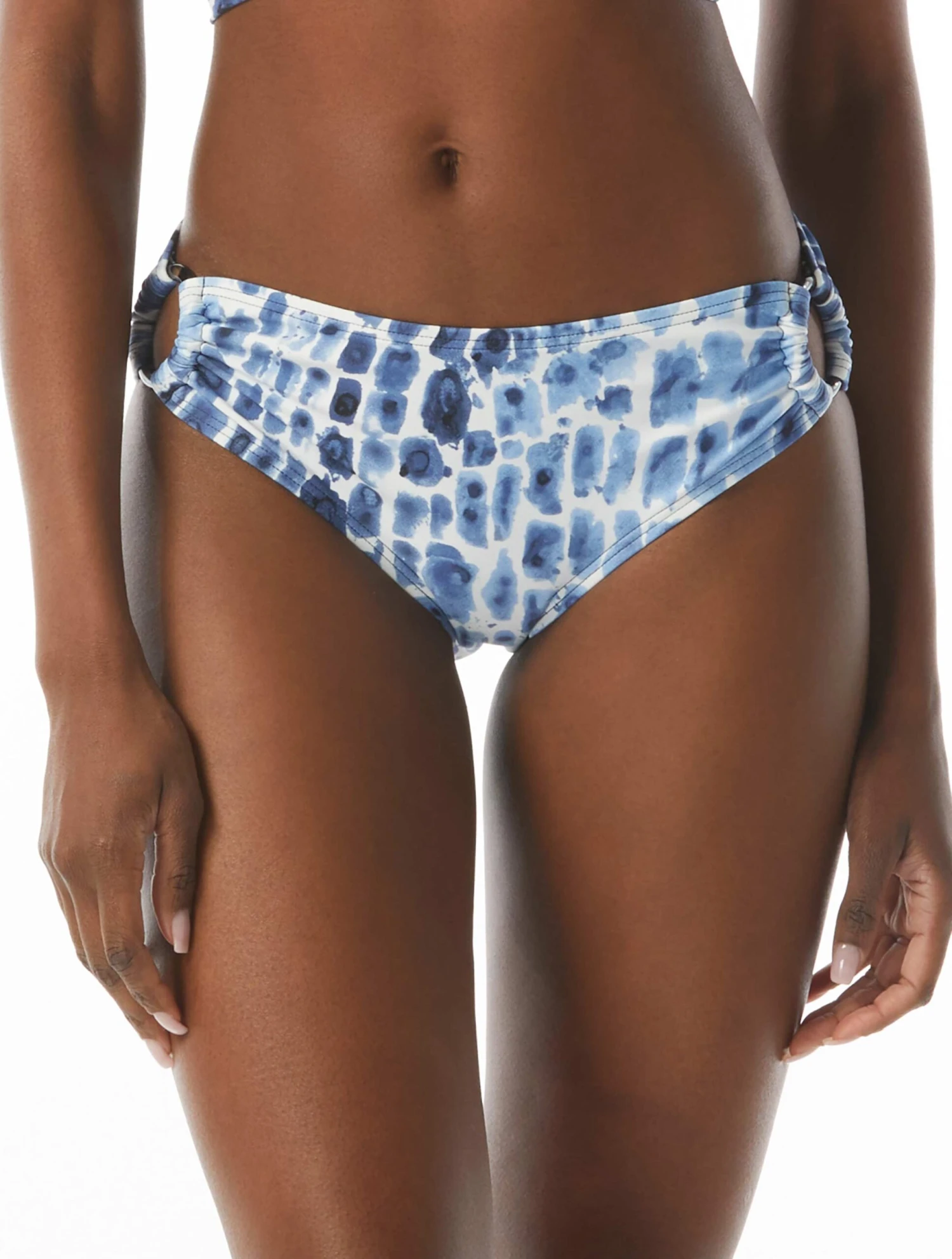 The Carmen Marc Valvo Bikini Bottom features a side ring trim detail and shades of blue print inspired by the hues of the Amalfi Coast.
