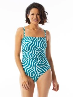 You’re born to be wild in the Coco Contours Jasper Bandeau Bra Sized One Piece Swimsuit! In a bold zebra print in a fashionable teal colorway, this bandeau one piece is perfect for days spent lounging in the sun or diving into the water. This one piece swimsuit is designed with molded cups for shape, adjustable, detachable straps for additional support, and our Patented Shapemaker® Lining that smooths your curves and lifts your bottom to accentuate your figure.