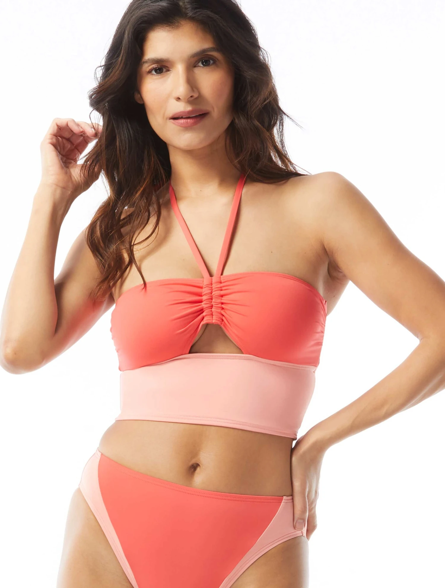 A bold bikini top paired with bold colorblocking, makes this an ultra bold swimwear staple! Topped off with just the right amount of fashionable details like adjustable halter neckline, cut out front and removable soft cups.